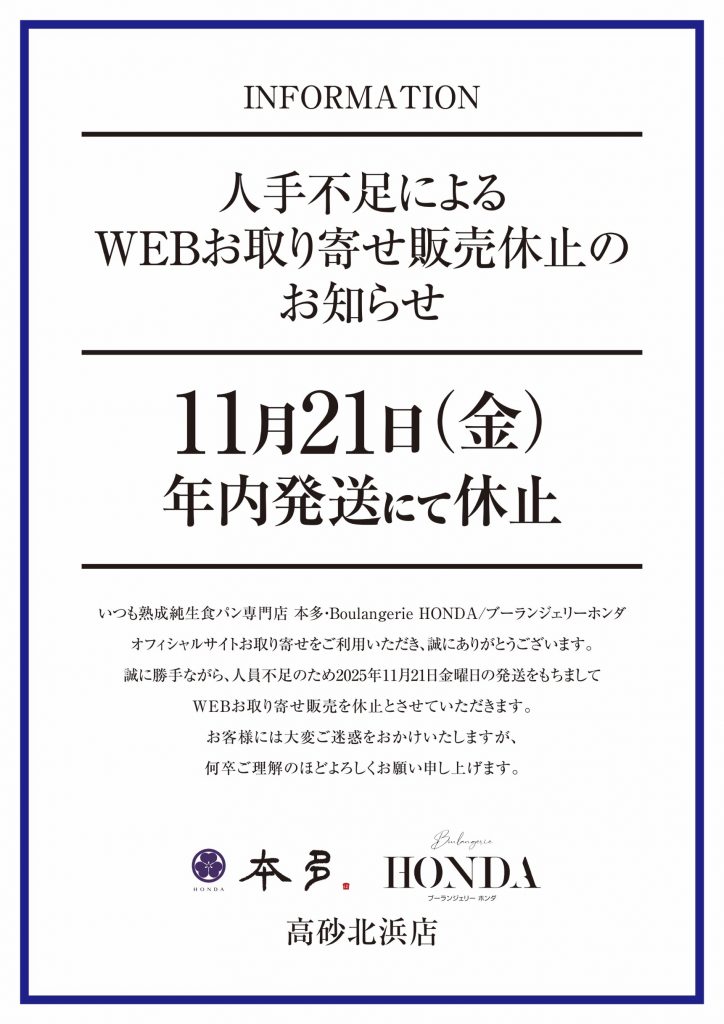 誠に勝手ながら、人員不足のため2025年11月21日金曜日の発送をもちましてWEBお取り寄せ販売を休止とさせていただきます。